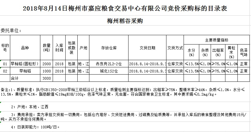 2018年8月14日梅州市金良糧食收儲有限公司稻谷采購