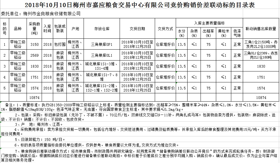 受客戶(hù)委托,梅州市嘉應(yīng)糧食交易中心有限公司定于2018年10月10日(星期三)舉辦稻谷購(gòu)銷(xiāo)價(jià)差聯(lián)動(dòng)標(biāo)的交易會(huì),梅州市金良糧食收儲(chǔ)有限公司擬銷(xiāo)售和采購(gòu)早秈稻10874噸。