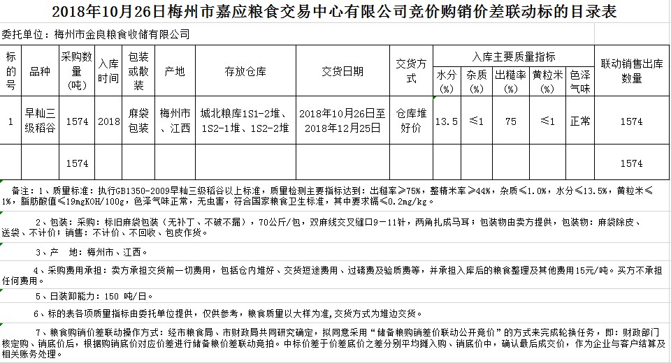 受客戶委托,梅州市嘉應(yīng)糧食交易中心有限公司定于2018年10月26日(星期五)舉辦稻谷購銷價差聯(lián)動標(biāo)的交易會,梅州市金良糧食收儲有限公司擬銷售和采購早秈稻1574噸。