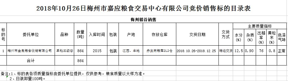 受客戶(hù)委托,梅州市嘉應(yīng)糧食交易中心有限公司定于2018年10月26日(星期五)舉辦糧食競(jìng)價(jià)交易會(huì),梅州市金良糧食收儲(chǔ)有限公司擬銷(xiāo)售2015年早秈稻864噸。