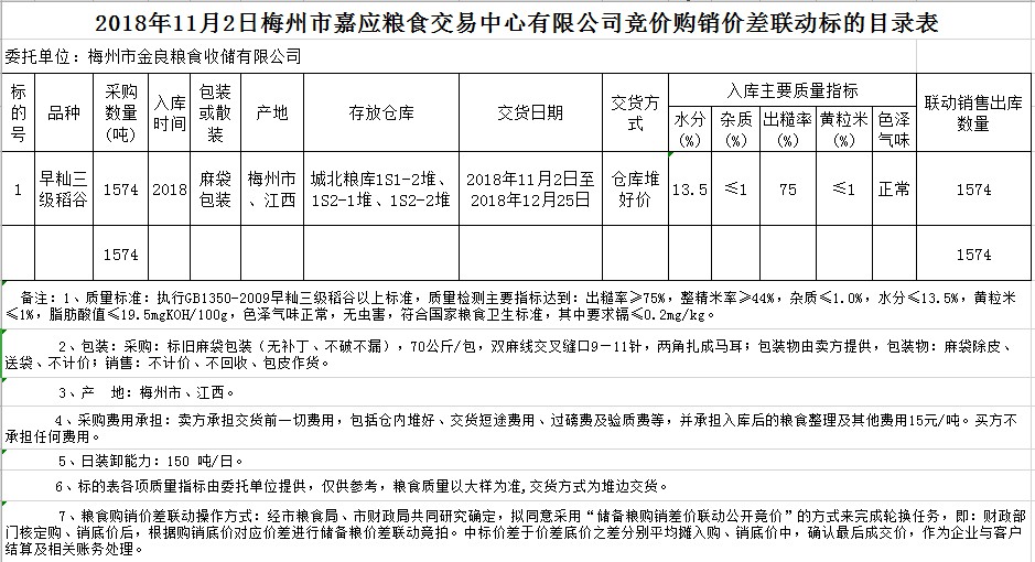 受客戶委托,梅州市嘉應(yīng)糧食交易中心有限公司定于2018年11月2日(星期五)舉辦稻谷購(gòu)銷(xiāo)價(jià)差聯(lián)動(dòng)標(biāo)的交易會(huì),梅州市金良糧食收儲(chǔ)有限公司擬銷(xiāo)售和采購(gòu)早秈稻1574噸。