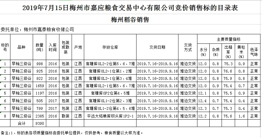 受客戶委托,梅州市嘉應(yīng)糧食交易中心有限公司定于2019年7月15日(星期一)舉辦糧食競(jìng)價(jià)交易會(huì),梅州市嘉泰糧食收儲(chǔ)公司擬銷售2016年、2017年早秈稻9390噸。