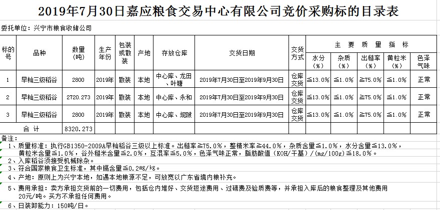 受客戶(hù)委托,梅州市嘉應(yīng)糧食交易中心有限公司定于2019年7月30日(星期二)舉辦糧食競(jìng)價(jià)交易會(huì),興寧市糧食收儲(chǔ)公司擬采購(gòu)2019年早秈稻8320.273噸。