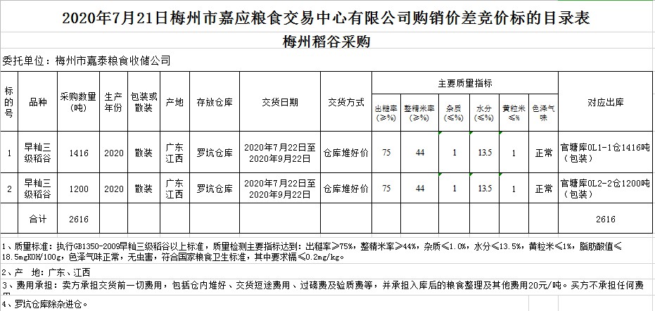 受客戶委托,梅州市嘉應(yīng)糧食交易中心有限公司定于2020年7月21日(星期二)舉辦稻谷購(gòu)銷價(jià)差聯(lián)動(dòng)標(biāo)的交易會(huì),梅州市嘉泰糧食收儲(chǔ)公司擬銷售和采購(gòu)早秈稻2616噸。