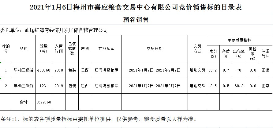 受客戶委托,梅州市嘉應(yīng)糧食交易中心有限公司定于2021年1月6日(星期三)舉辦糧食競價(jià)交易會(huì),汕尾紅海灣經(jīng)濟(jì)開發(fā)區(qū)儲(chǔ)備糧管理公司擬銷售2018年早秈三級(jí)稻谷468.68噸;2019年早秈三級(jí)稻谷1231噸。