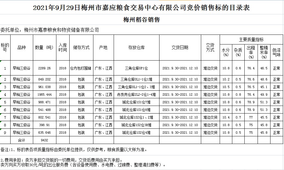 2021年9月29日梅州市嘉泰糧食和物資儲備有限公司稻谷銷售