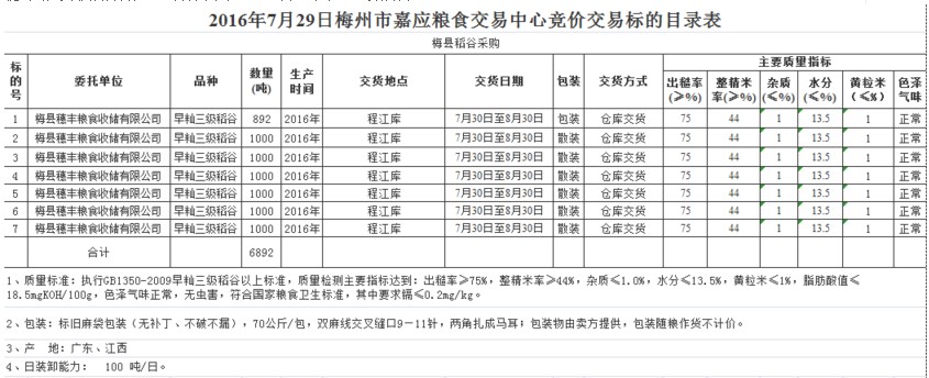 受客戶(hù)委托,梅州市嘉應(yīng)糧食交易中心有限公司定于2016年7月29日舉辦糧食競(jìng)價(jià)交易會(huì),梅州市梅縣區(qū)穗豐糧食收儲(chǔ)有限公司擬采購(gòu)2016年產(chǎn)早秈三級(jí)稻谷6892噸。