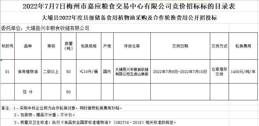大埔縣2022年度縣級儲備食用植物油采購及合作輪換費(fèi)用公開招投標(biāo)公告