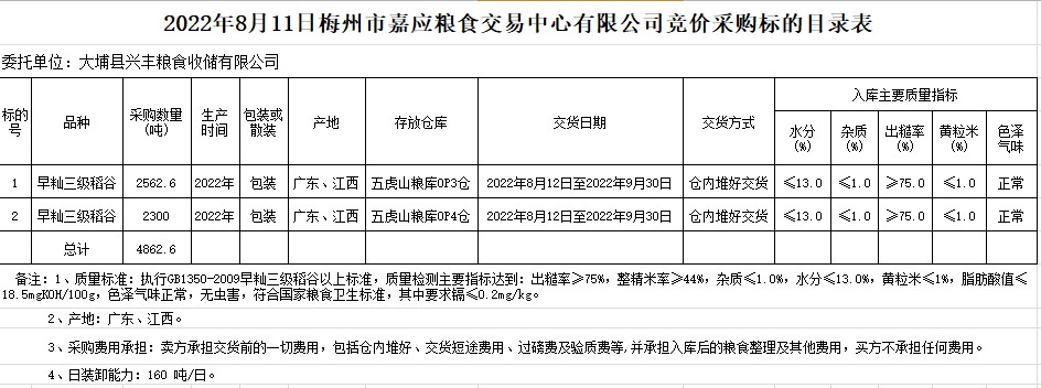 2022年8月11日大埔縣興豐糧食收儲(chǔ)有限公司稻谷采購(gòu)