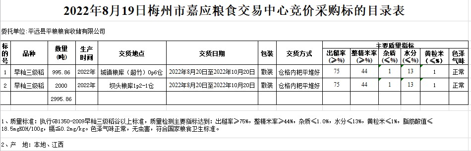 受客戶委托,梅州市嘉應(yīng)糧食交易中心有限公司定于2022年8月19日(星期五)舉辦糧食競(jìng)價(jià)交易會(huì)。平遠(yuǎn)縣平糧糧食收儲(chǔ)有限公司擬采購(gòu)2022年早秈稻2995.86噸。