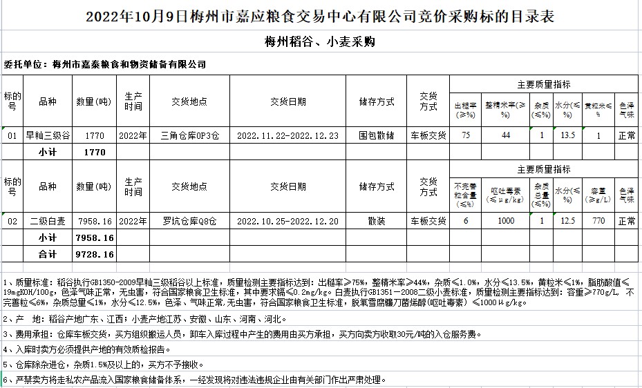 受客戶委托,梅州市嘉應(yīng)糧食交易中心有限公司定于2022年10月9日(星期日)舉辦糧食競價交易會。梅州市嘉泰糧食和物資儲備有限公司擬采購2022年早秈稻1770噸、二級白麥7958.16噸。