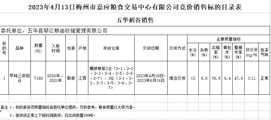 受客戶委托,梅州市嘉應(yīng)糧食交易中心有限公司定于2023年4月13日(星期四)舉辦糧食競(jìng)價(jià)交易會(huì)。五華縣琴江糧油收儲(chǔ)管理有限公司擬銷售2020、2021年早秈稻7160噸。