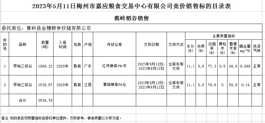 受客戶委托,梅州市嘉應(yīng)糧食交易中心有限公司定于2023年5月11日(星期四)舉辦糧食競價(jià)交易會(huì)。蕉嶺縣金穗糧食收儲(chǔ)有限公司擬銷售2020年早秈稻3534.79噸。