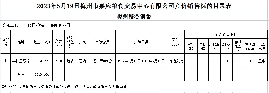 受客戶委托,梅州市嘉應糧食交易中心有限公司定于2023年5月19日(星期五)舉辦糧食競價交易會。豐順縣糧食收儲有限公司擬銷售2020年早秈稻2219.194噸。