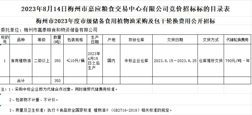 受梅州市嘉泰糧食和物資儲(chǔ)備有限公司委托,梅州市嘉應(yīng)糧食交易中心有限公司定于2023年8月14日(星期一)上午10時(shí)15分舉辦梅州市市級(jí)儲(chǔ)備食用植物油采購(gòu)及包干輪換費(fèi)用公開招標(biāo)。