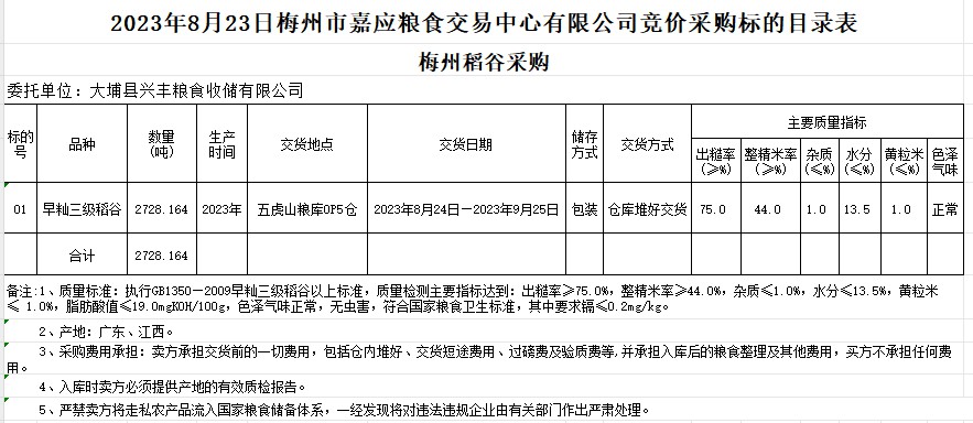 2023年8月23日大埔縣興豐糧食收儲有限公司稻谷采購