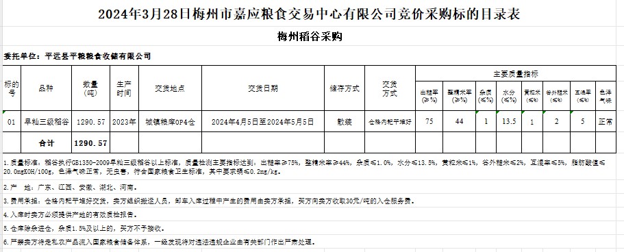 受客戶委托,梅州市嘉應糧食交易中心有限公司定于2024年3月28日(星期四)舉辦糧食競價交易會。平遠縣平糧糧食收儲有限公司擬采購2023年產早秈稻1290.57噸。