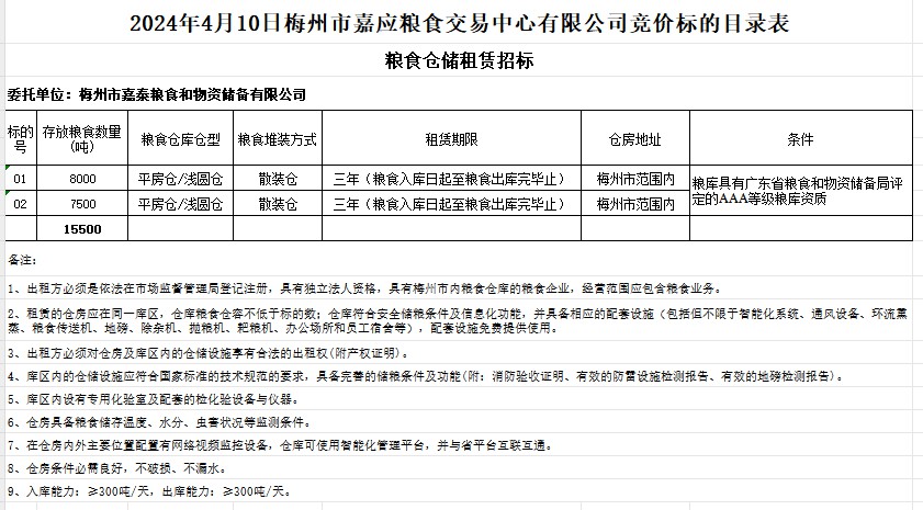 受客戶委托,梅州市嘉應(yīng)糧食交易中心有限公司定于2024年4月10日(星期三)上午10時在廣東省梅州市彬芳大道南161號梅州市糧食交易中心3樓,舉辦糧食倉儲租賃招標(biāo)交易會。梅州市嘉泰糧食和物資儲備有限公司擬租賃15500噸糧食倉容及配套設(shè)施。