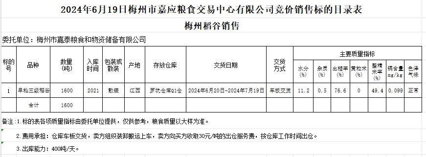2024年6月19日梅州市嘉泰糧食和物資儲(chǔ)備有限公司稻谷銷售