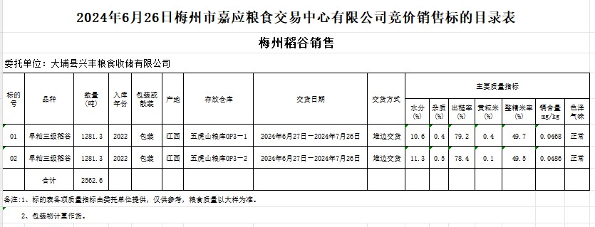 受客戶(hù)委托,梅州市嘉應(yīng)糧食交易中心有限公司定于2024年6月26日(星期三)舉辦糧食競(jìng)價(jià)交易會(huì)。大埔縣興豐糧食收儲(chǔ)有限公司擬銷(xiāo)售2022年產(chǎn)早秈稻谷2562.6噸。