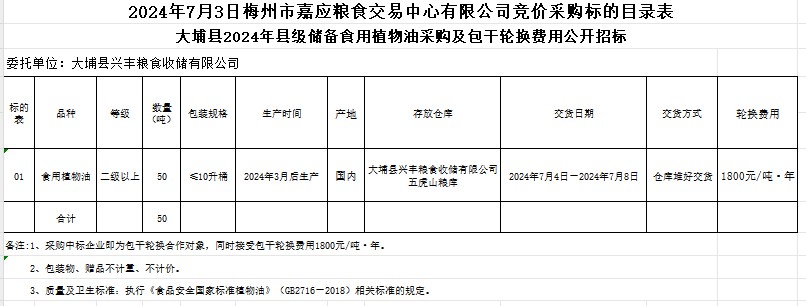 受大埔縣興豐糧食收儲(chǔ)有限公司委托,梅州市嘉應(yīng)糧食交易中心有限公司定于2024年7月3日(星期三)上午10時(shí)在廣東省梅州市彬芳大道南161號(hào)梅州市糧食交易中心3樓,舉辦大埔縣2024年縣級(jí)儲(chǔ)備食用植物油采購及包干輪換費(fèi)用公開招標(biāo)。
