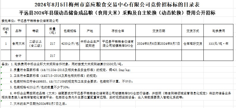 受客戶委托,梅州市嘉應(yīng)糧食交易中心有限公司定于2024年8月5日(星期一)上午10時(shí)在廣東省梅州市彬芳大道南161號(hào)梅州市糧食交易中心3樓,舉辦平遠(yuǎn)縣2024年縣級(jí)動(dòng)態(tài)儲(chǔ)備成品糧(食用大米)采購(gòu)及自主輪換(動(dòng)態(tài)輪換)費(fèi)用公開(kāi)招標(biāo)。