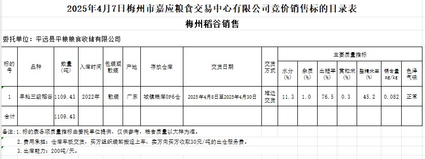 受客戶委托,梅州市嘉應(yīng)糧食交易中心有限公司定于2025年4月7日(星期一)舉辦糧食競價交易會。平遠縣平糧糧食收儲有限公司擬銷售2022年產(chǎn)早秈稻1109.43噸。