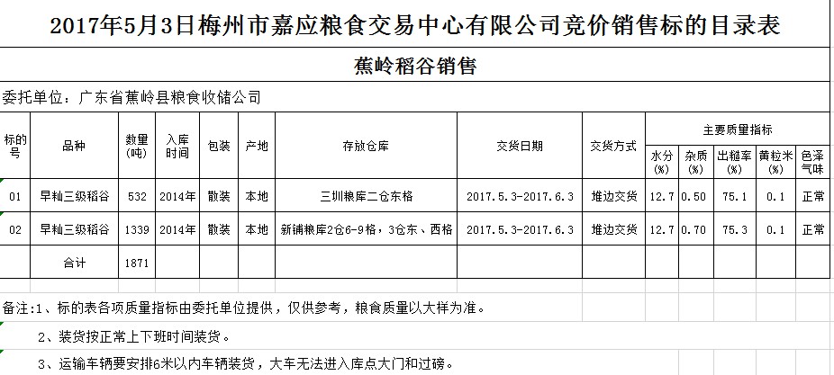 受客戶委托,梅州市嘉應(yīng)糧食交易中心有限公司定于2017年5月3日舉辦糧食競價交易會,廣東省蕉嶺縣糧食收儲公司擬銷售2014年早秈三級稻谷1871噸。