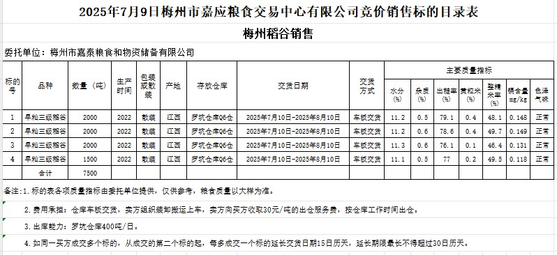 2025年7月9日梅州市嘉泰糧食和物資儲備有限公司稻谷銷售
