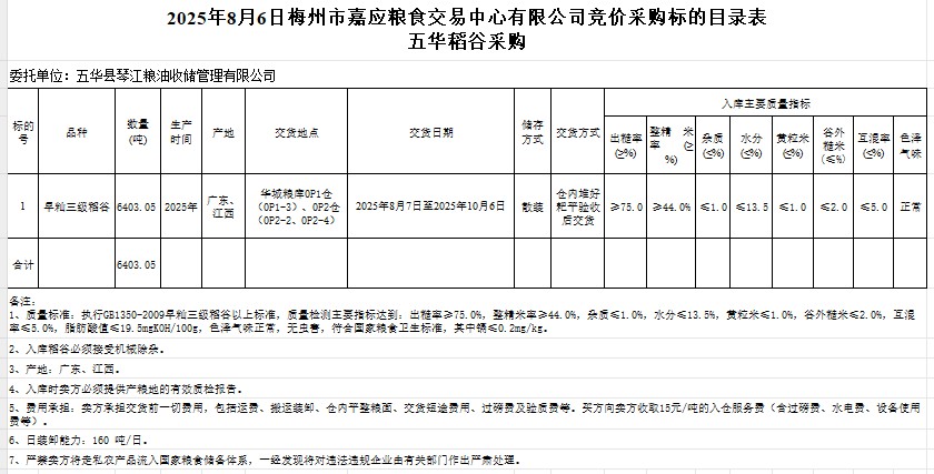 受客戶委托,梅州市嘉應糧食交易中心有限公司定于2025年8月6日(星期三)舉辦糧食競價交易會。五華縣琴江糧油收儲管理有限公司擬采購2025年產(chǎn)早秈稻谷6403.05噸。