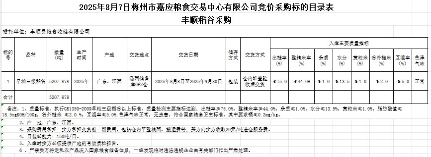 受客戶委托,梅州市嘉應(yīng)糧食交易中心有限公司定于2025年8月7日(星期四)舉辦糧食競價(jià)交易會(huì)。豐順縣糧食收儲有限公司擬采購2025年產(chǎn)早秈稻谷5207.878噸。