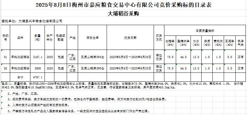 2025年8月8日大埔縣興豐糧食收儲(chǔ)有限公司稻谷采購(gòu)