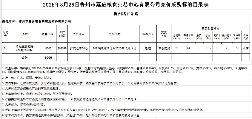 2025年8月26日梅州市嘉泰糧食和物資儲備有限公司稻谷采購
