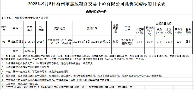 2025年9月5日蕉嶺縣金穗糧食收儲(chǔ)有限公司稻谷采購(gòu)