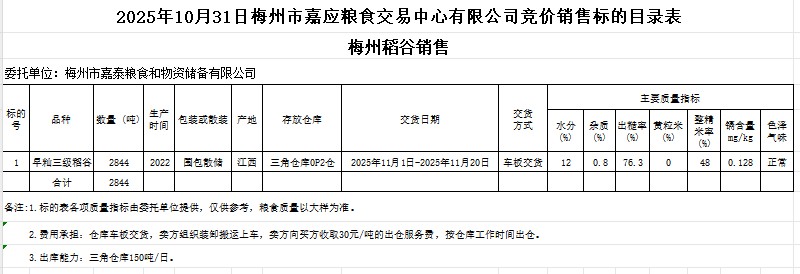 2025年10月31日梅州市嘉泰糧食和物資儲備有限公司稻谷銷售