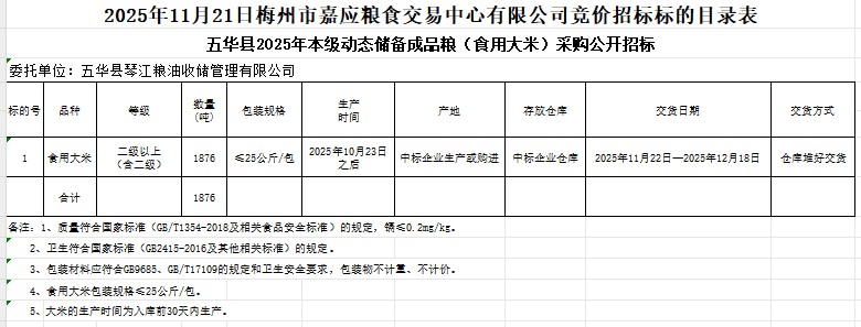文件下載:2025年11月21日五華縣2025年本級動態(tài)儲備成品糧(食用大米)采購及代儲包干輪換費(fèi)用公開招標(biāo)公告