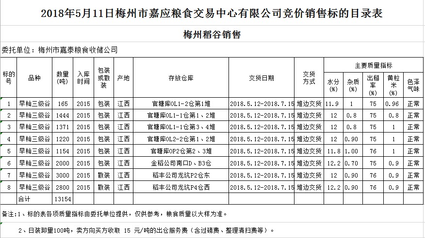 受客戶委托,梅州市嘉應(yīng)糧食交易中心有限公司定于2018年5月11日(星期五)舉辦糧食競價交易會,梅州市嘉泰糧食收儲公司擬銷售早秈稻13154噸。