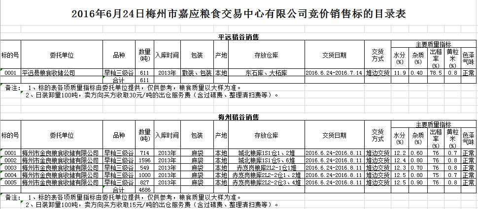 受客戶委托,梅州市嘉應(yīng)糧食交易中心有限公司定于2016年6月24日舉辦糧食競價交易會,平遠(yuǎn)縣糧食收儲公司擬銷售2013年早秈稻谷611噸,梅州市金良糧食收儲有限公司擬銷售2013年早秈稻谷4686噸。
