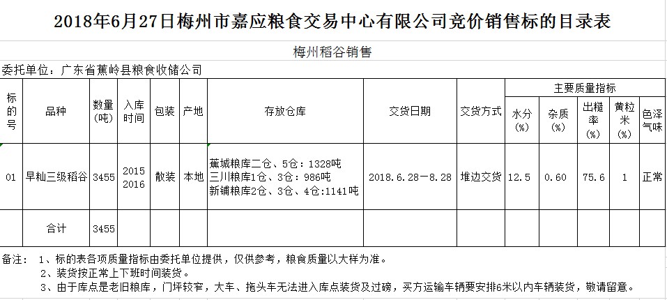 受客戶(hù)委托,梅州市嘉應(yīng)糧食交易中心有限公司定于2018年6月27日(星期三)舉辦糧食競(jìng)價(jià)交易會(huì),廣東省蕉嶺縣糧食收儲(chǔ)公司擬銷(xiāo)售早秈稻3455噸。