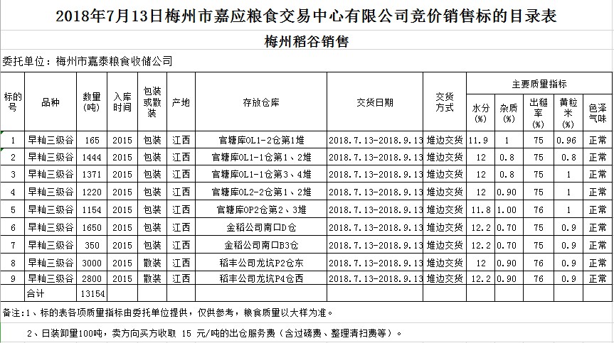受客戶委托,梅州市嘉應(yīng)糧食交易中心有限公司定于2018年7月13日(星期五)舉辦糧食競價交易會,梅州市嘉泰糧食收儲公司擬銷售早秈稻13154噸。